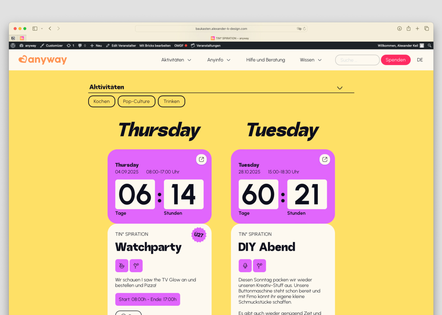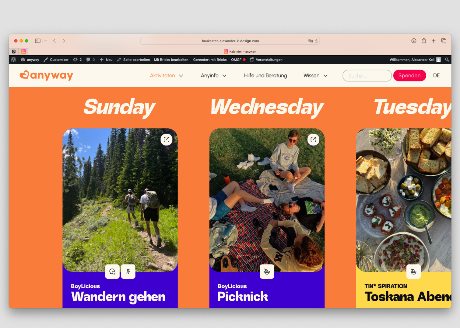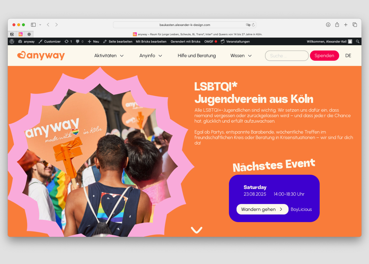 Working together with the anyway e.v. their website was redesigned and later developed using WordPress and Bricks. The environment was chosen based on the wished of the anyway team to allow content management on a familiar platform. The challenge of the design was to apply the new branding guidelines to old information pages and to develop a new homepage and calendar page.