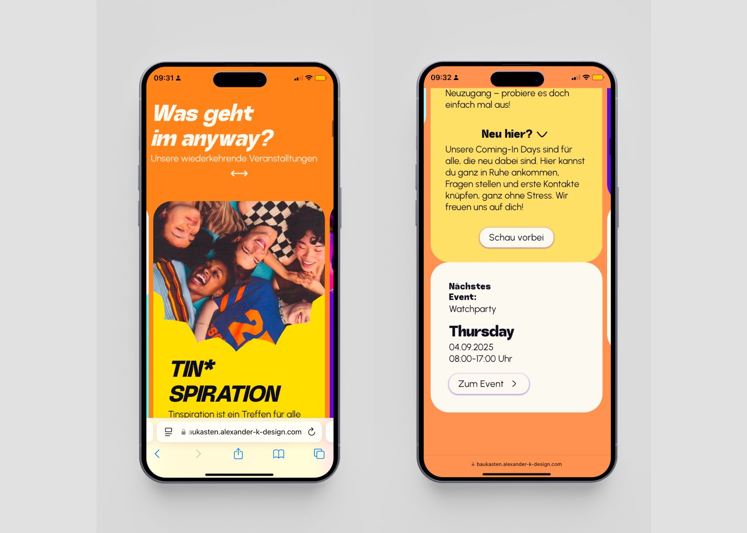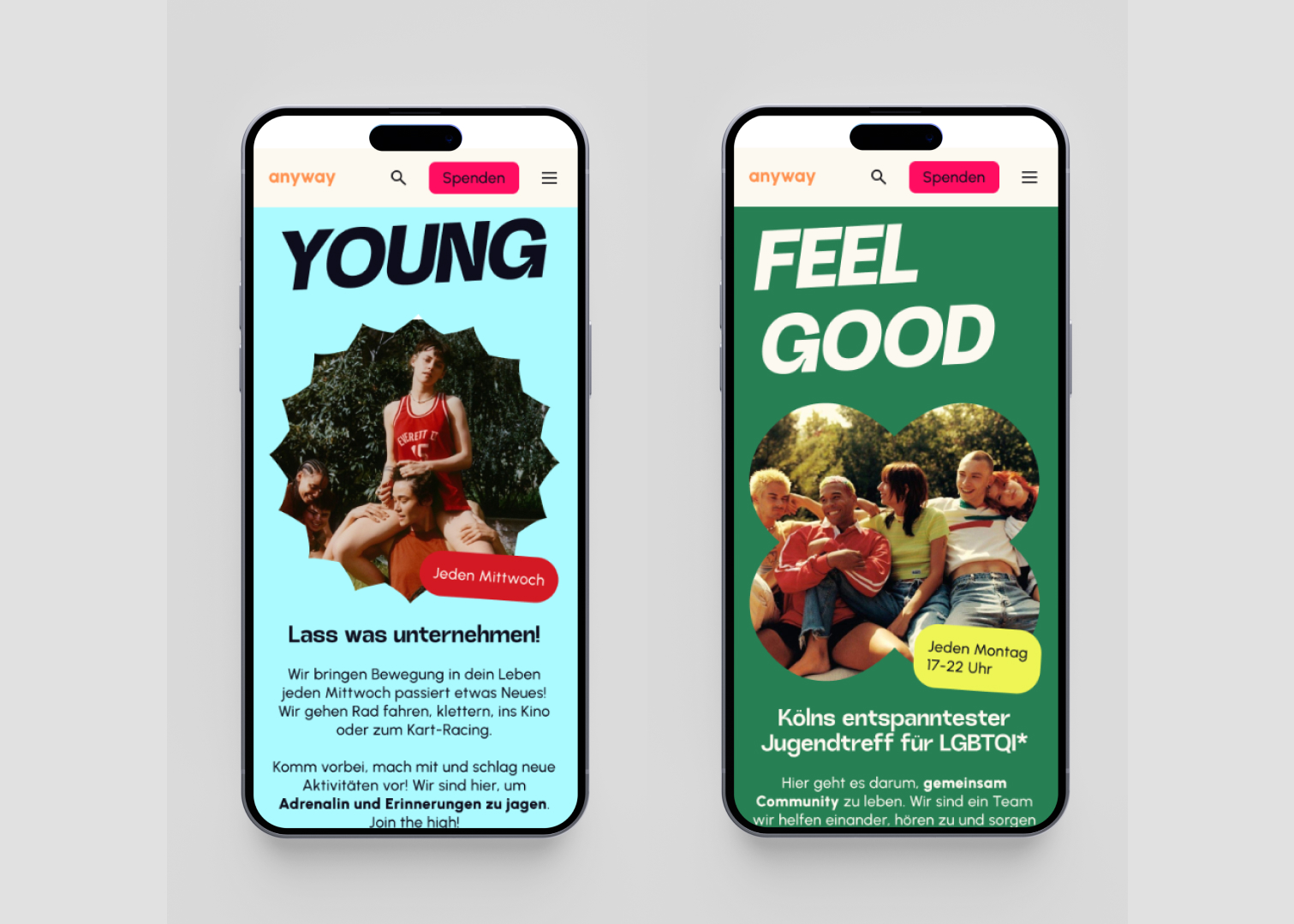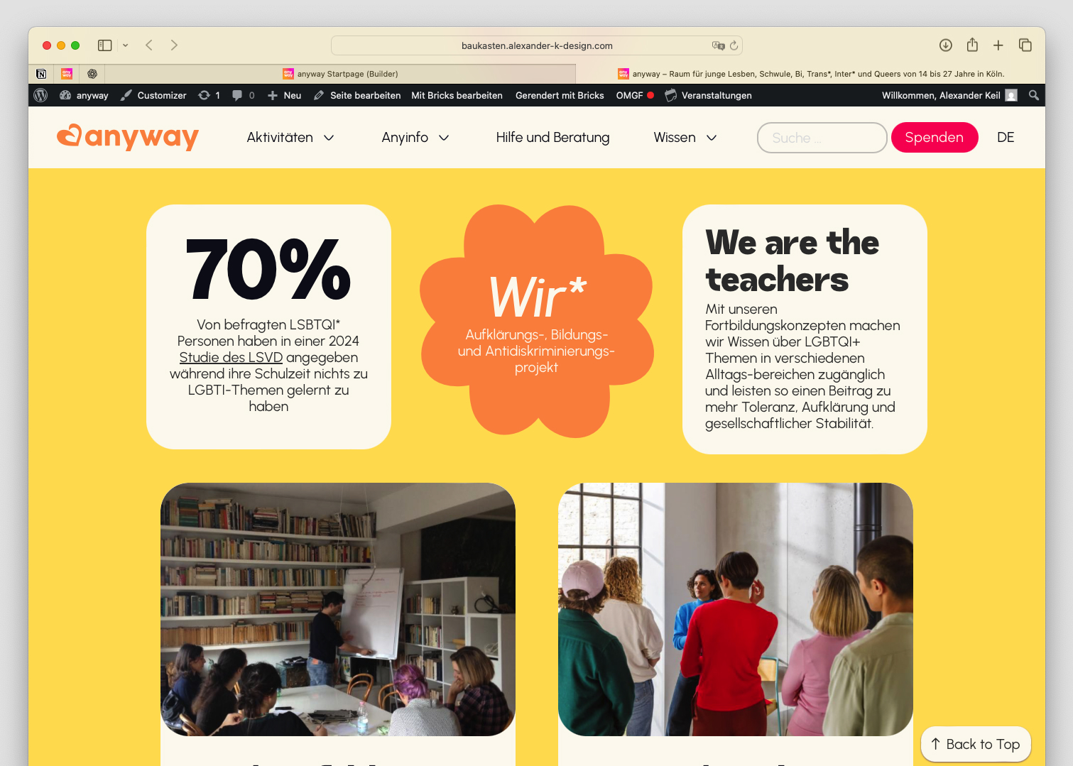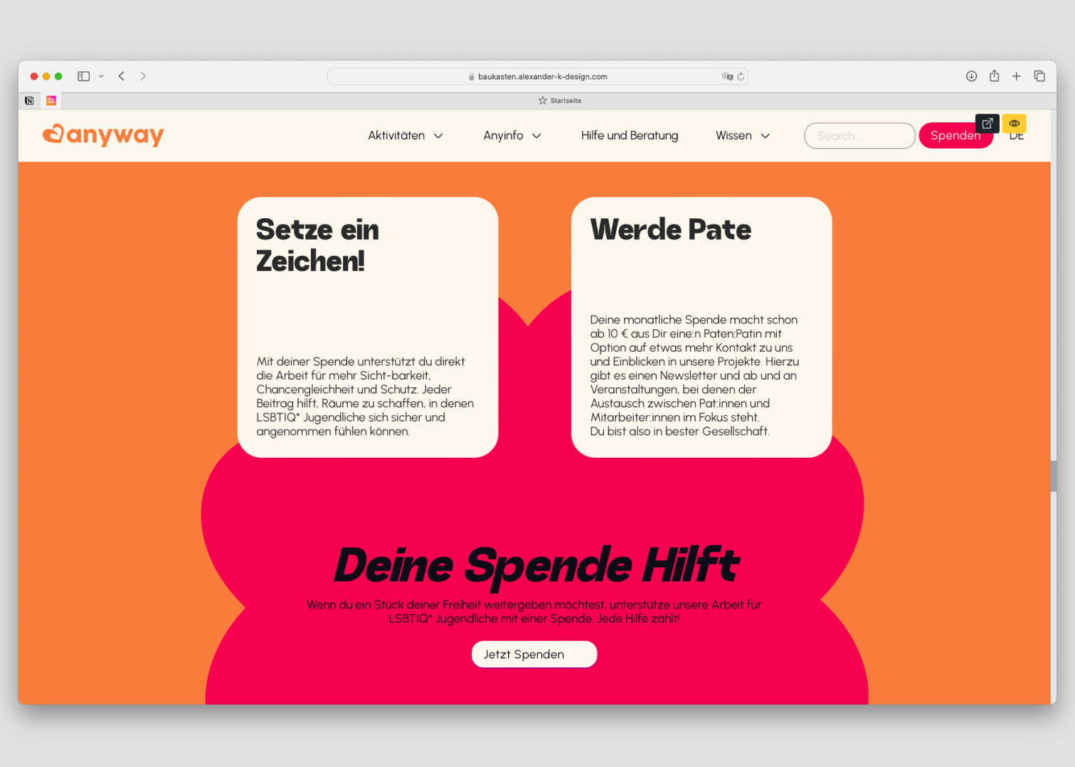 Working together with the anyway e.v. their website was redesigned and later developed using WordPress and Bricks. The environment was chosen based on the wished of the anyway team to allow content management on a familiar platform. The challenge of the design was to apply the new branding guidelines to old information pages and to develop a new homepage and calendar page.