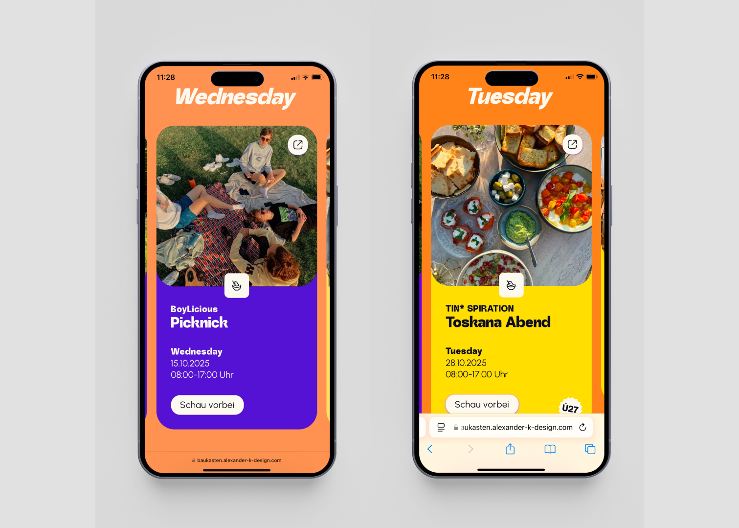 Events are displayed with color coding for the respective activities and a focus on images as well as the weekday when the event takes place.