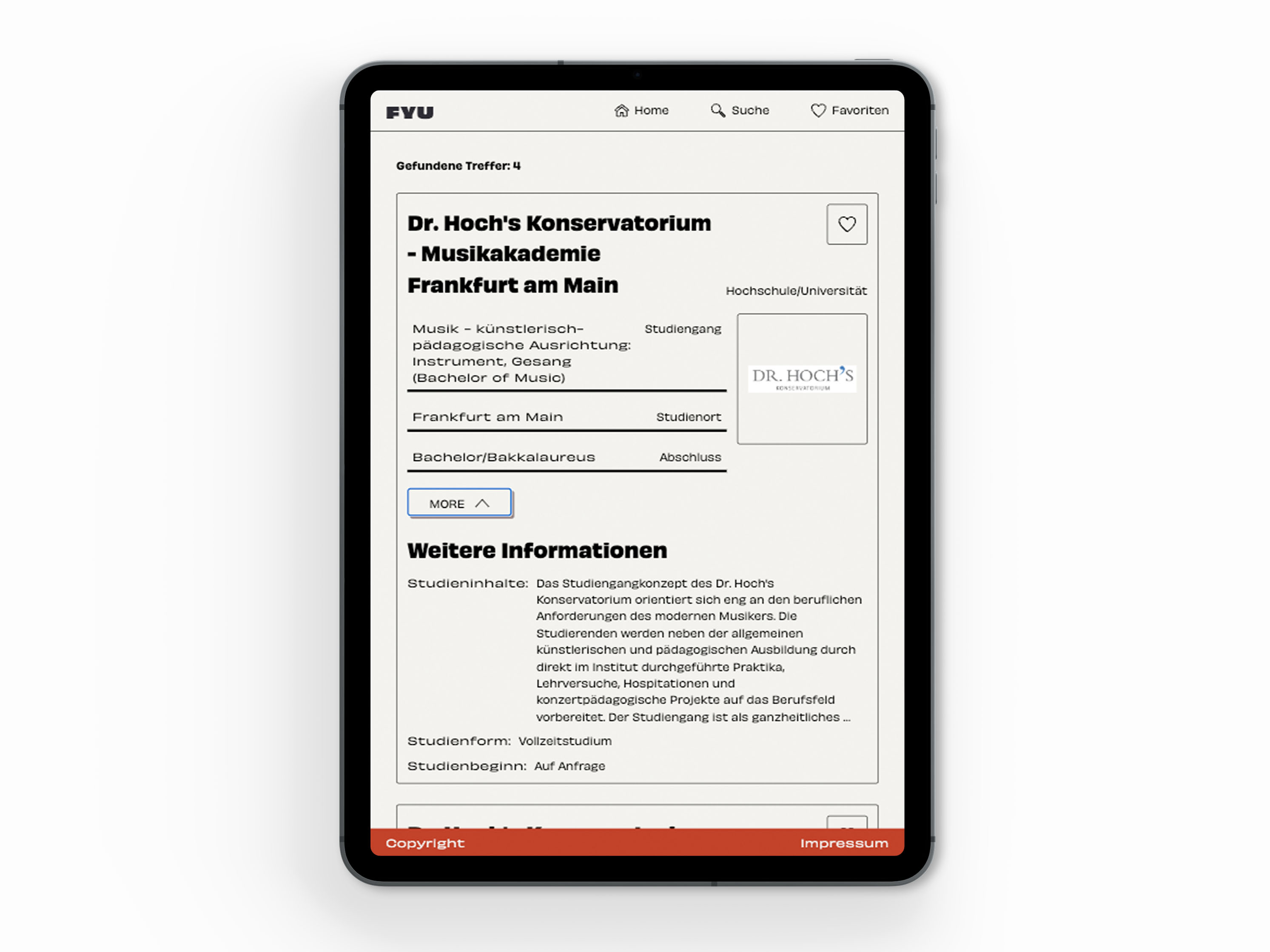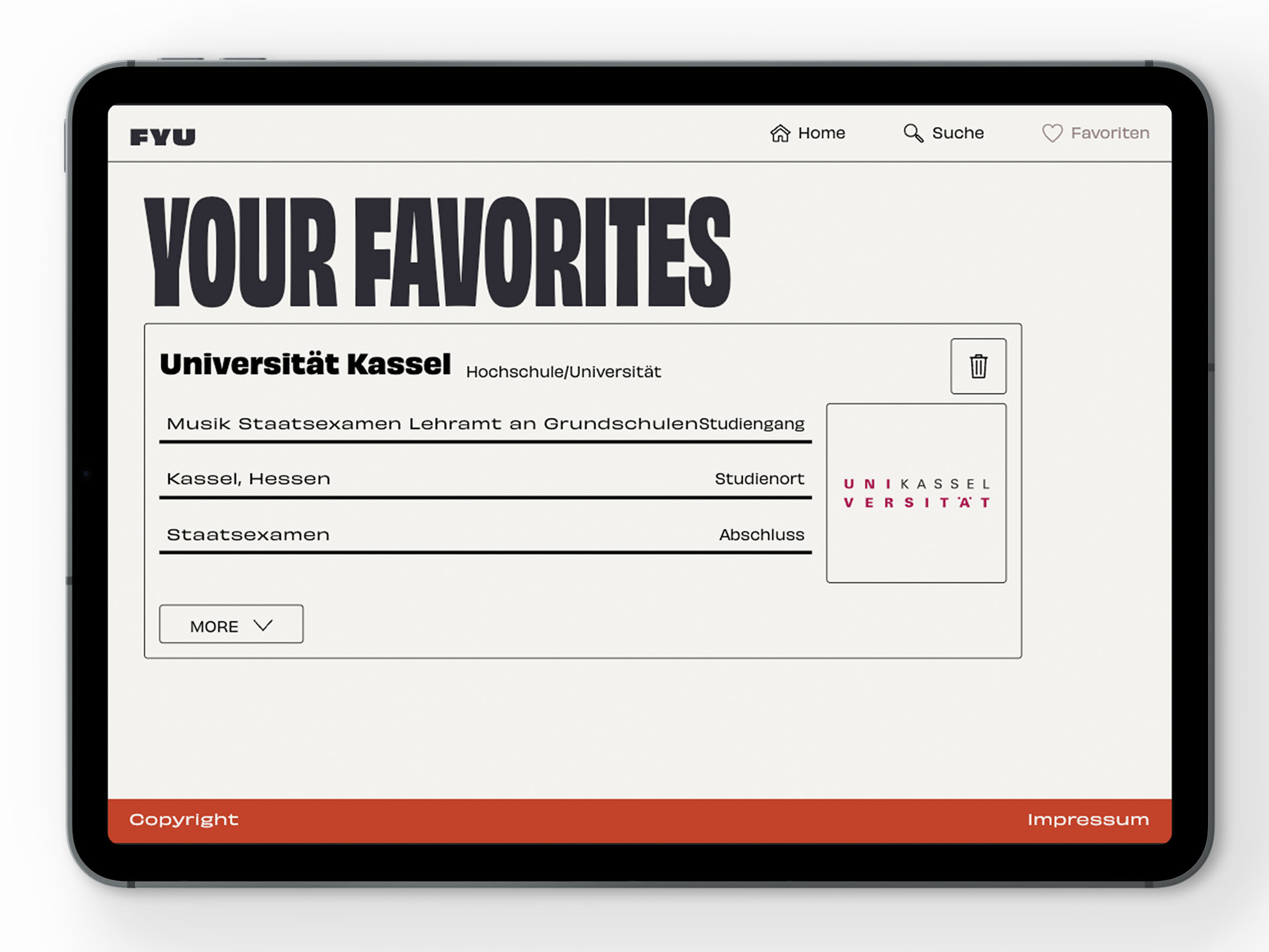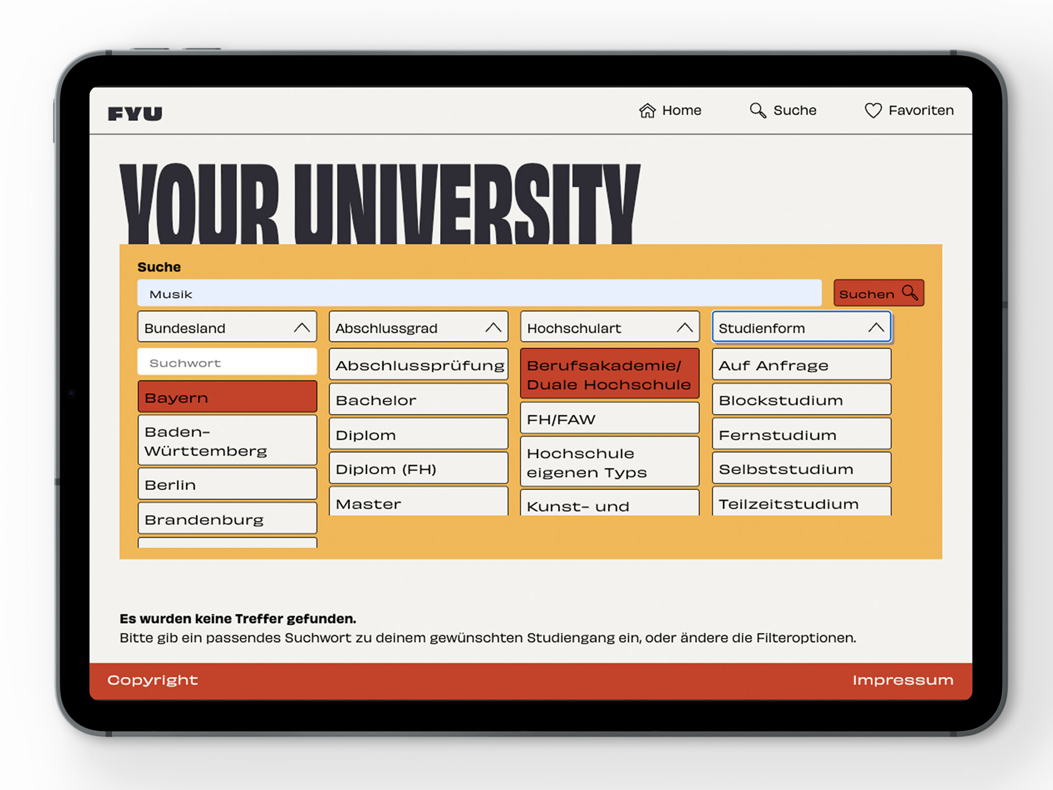 The Studiensuche API from the BUND is used to map information of all German Universities and courses to allow for a comprehensive search tool. The Prototype was built with Figma, allowing for a fast tracked frontend design. Universities can be liked, a status which is temporarily saved on the server. Vue.js is used to build a component based architecture with sensible child parent communication.